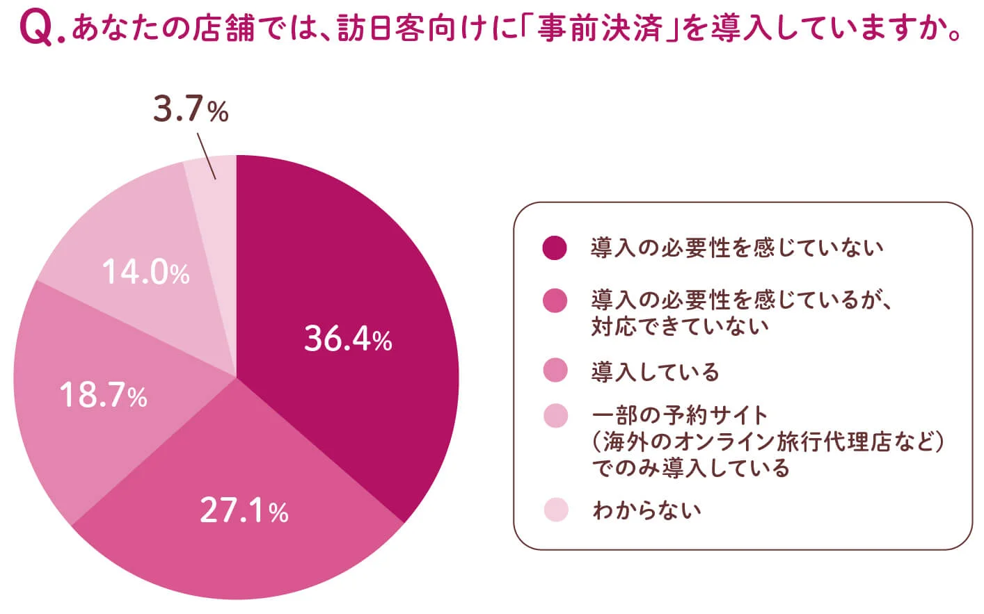 2.「『旅マエ予約』に対応した予約サービス」を未導入の飲食店では、約8割が「導入の必要性を感じていない」と回答した。一方で導入済みの飲食店では66.3%が、「(導入が売上向上に)貢献している」という結果になった。「『旅マエ予約』に対応した予約サービス」の導入有無によって訪日客の集客に大きな差が生じており、「旅マエ予約」に注力することが市場の取り込みにつながると推察できる。